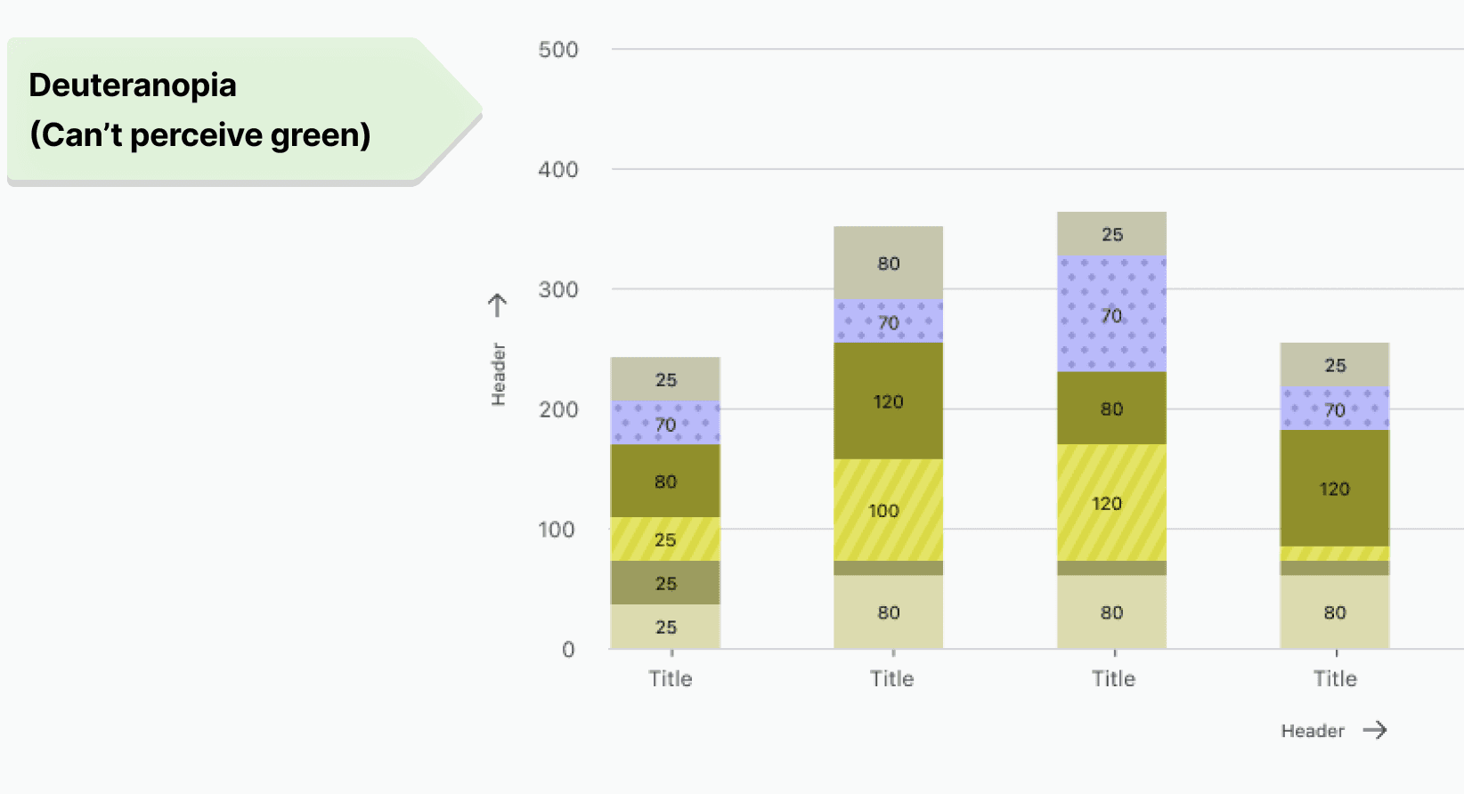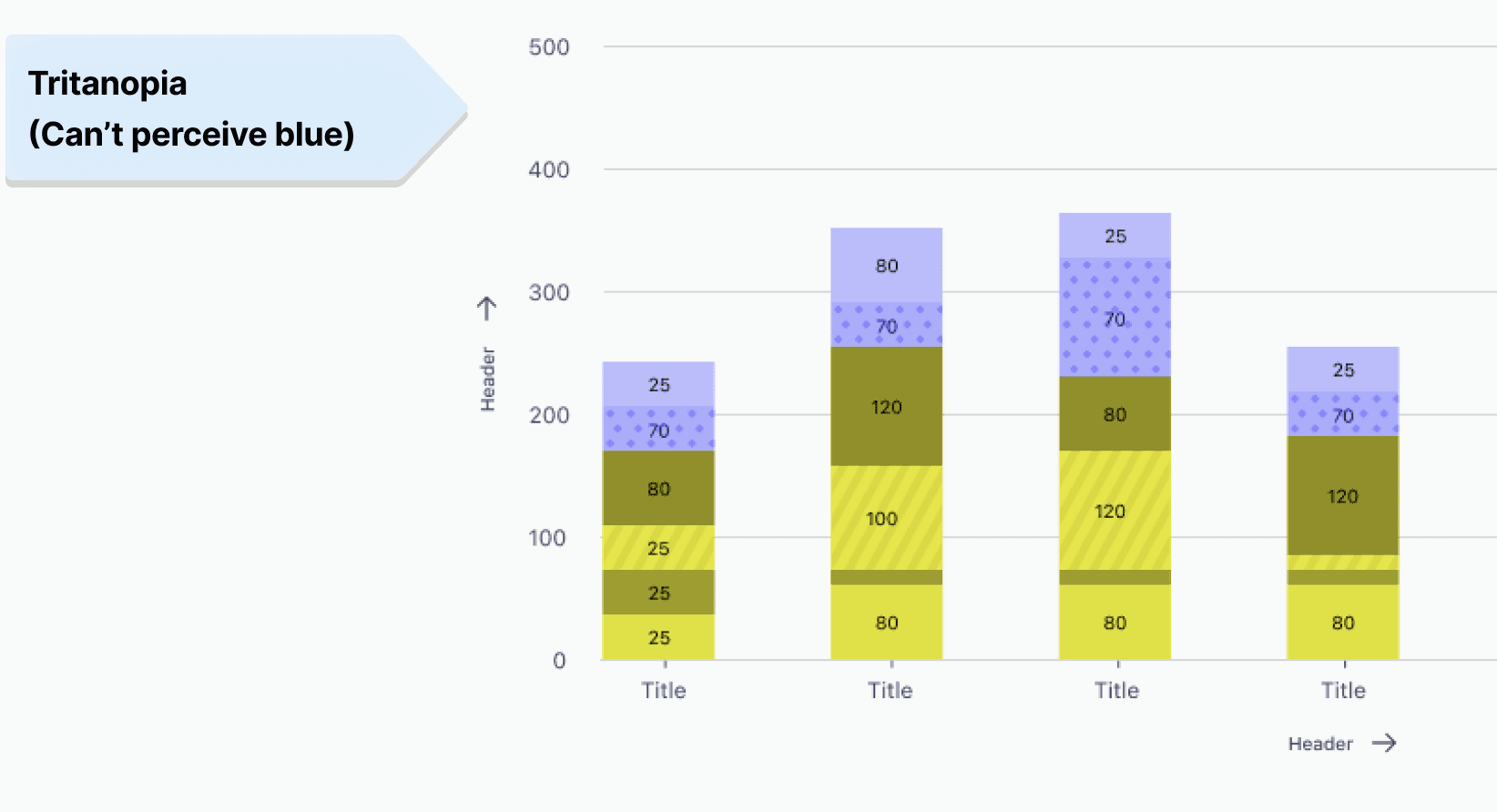 Data visualizing charts: For charts and graphs, I supplemented color with patterns and shapes to differentiate between elements effectively. So that people with varying color sensitivities can interpret the charts accurately. Examples of tritanopia and deutreranopia conditions are provided below to highlight the importance of this approach.