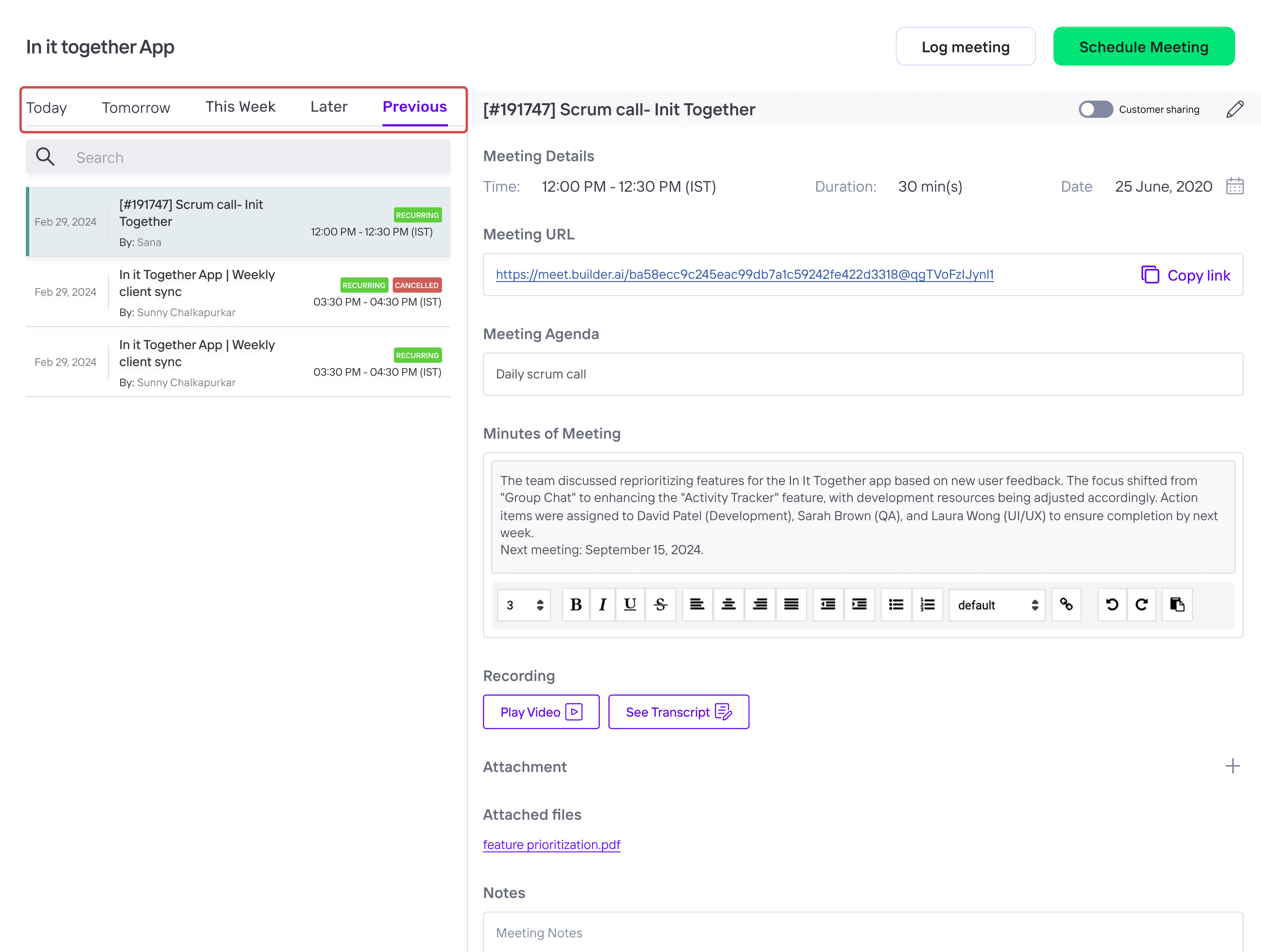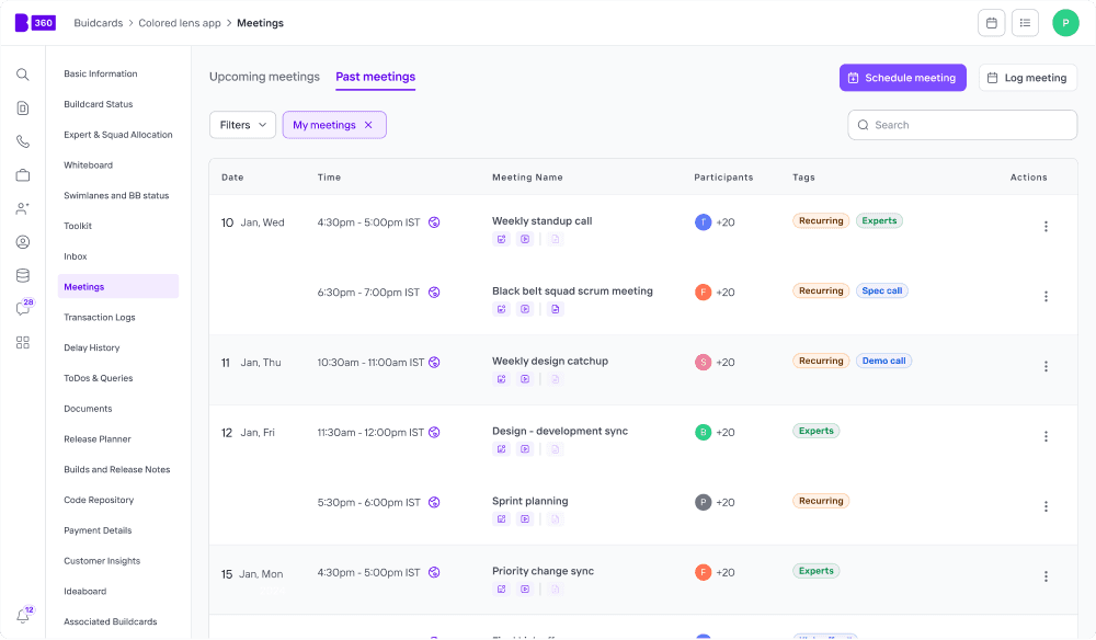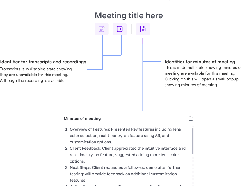 I added clear identifiers, allowing users to view agendas for upcoming meetings or minutes of meeting for past meetings. They can also check for available recordings and transcripts. Additionally, I incorporated filters to sort meetings by type, such as spec calls, kick-off calls, and expert calls.