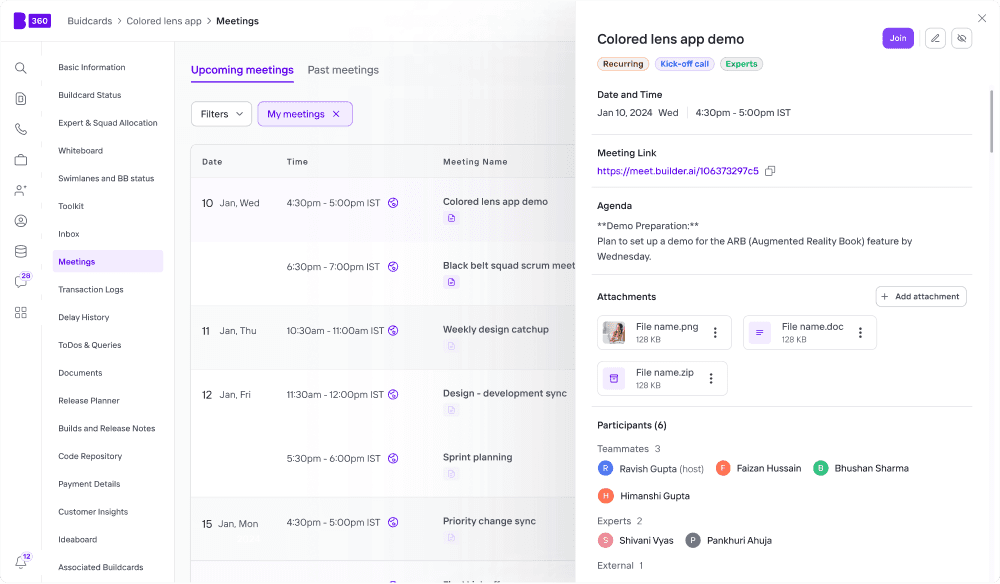 In order to create and view meetings of each project (Buildcard) the user has to go to the home page > select that buildcard > go to meetings > and then create meeting inside that particular buildcards’s page. This process is very cumbersome specially when the user has to manage multiple projects/ buildcards. So I introduced a global My meetings section where users can see their meetings. From here, they can also create meetings for any project/buildcard they are a handling.