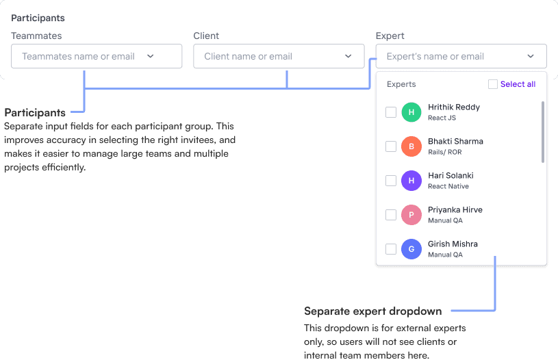Adding clients and third-party experts to meetings is difficult because this is how these groups are involved in one project: teammates (15-20 people), experts (10-25 people), and clients (1-10 people). With 8-10 attendees per meeting, finding the right invitees is tough. Because product managers and sales reps handle multiple projects with different participants.