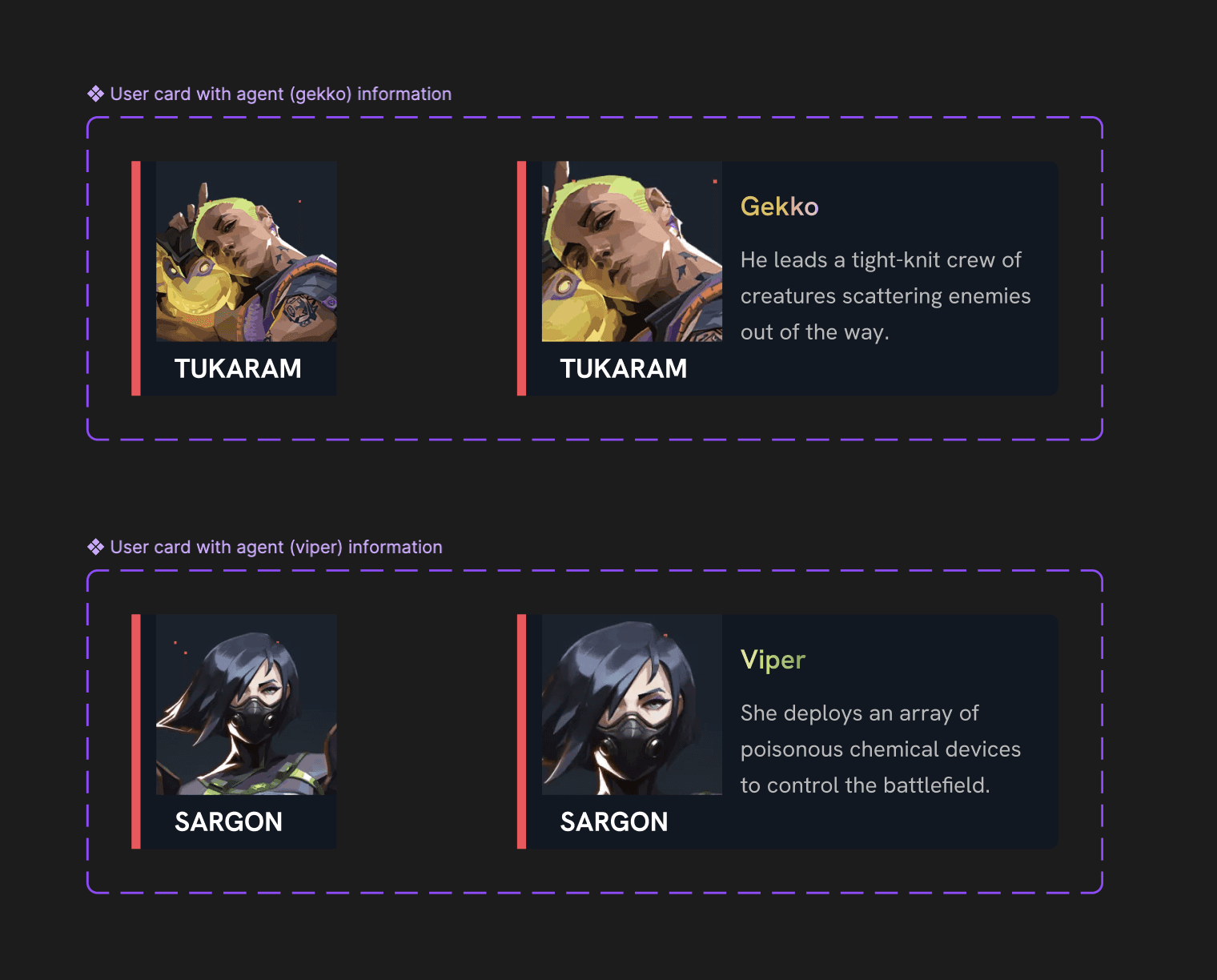 This is the player card component. On tap and hold it moves to expanded state. The expanded state reveals detailed information about the agent selected by the player, providing a comprehensive overview for strategic planning and team coordination.