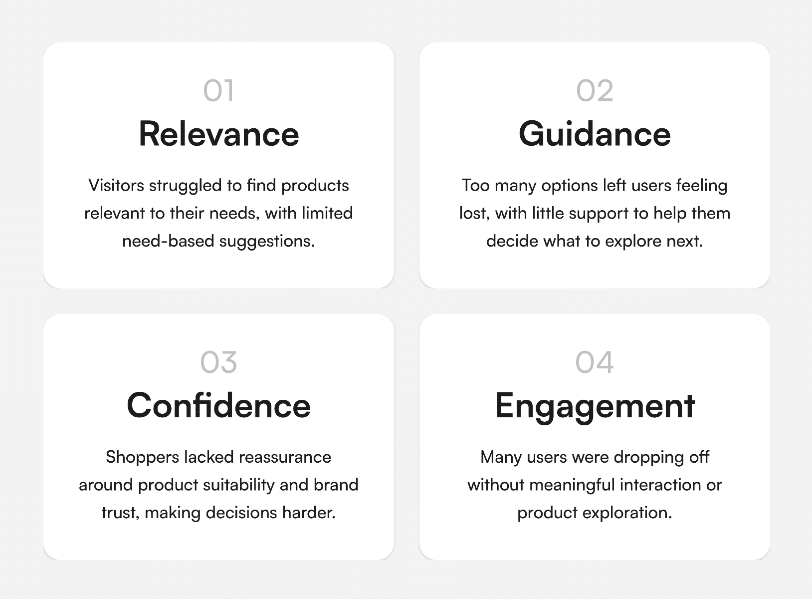 User research: We spoke with brands to understand how they currently handle product discovery, and information lookup on their websites. The research focused on understanding workflows, pain points, and their openness toward AI led support.